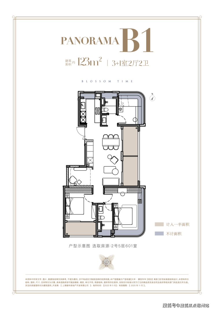 123㎡户型:名义单价13.46万/㎡,市场常规同面积段高层户型得房率按照81%计算,实得单价=13.46*81%/96%= 11.36万/㎡(数据模拟测算,仅供参考)