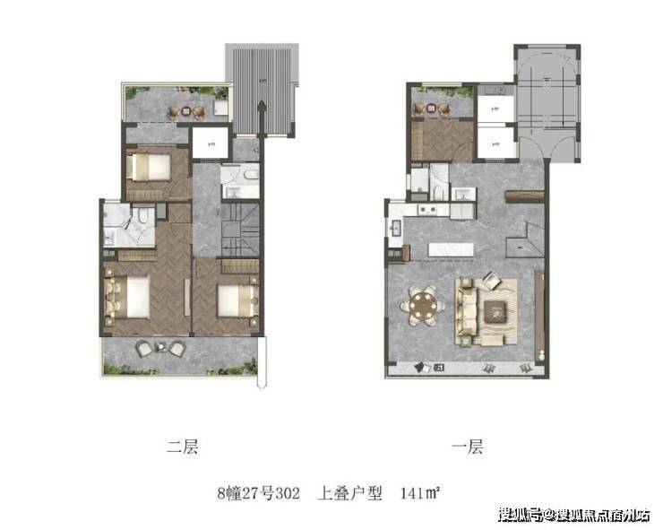 以建面约141㎡上叠户型为例:格局与下叠基本相同,约7.2米的横厅,客厅局部挑空。北向的储藏室附带阳台(阳台可打通,改造成北向房间),二层则拥有南北双露台。