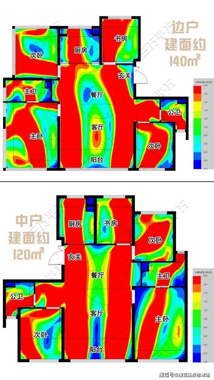 图上模拟计算的是在春夏季东南风环境下,户内的通风情况。颜色代表风速,红色最优,蓝色基本静止;箭头代表流动方向。 从中可以看到,大部分房间都有最大风速的红色箭头,表示 在开窗情况下 ,这些房间都有 优秀的通风条件 。