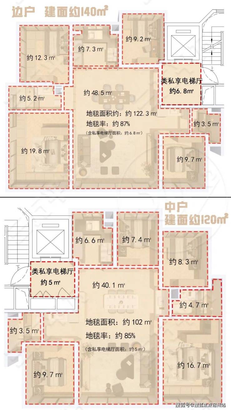 公区采用 类一梯一户 的配置,各自拥有私人享用的 类独立电梯厅 ;更重要的是,全房型均无北外廊干扰,无论是边户还是中户,都做到了真正意义上的完全南北通透,通风采光优秀;加上 全屋满飘窗和阳台的赠送 ——建面约 120㎡户型地毯率约85% ; 建面约140㎡户型的地毯率更是高达约87% ,在当下市场中, 地毯率能够到达80%以上的产品已经是佼佼者了 ,而 壹江臻邸项目首开两个户型的 地毯率双双突破了85% ,实属难得。
