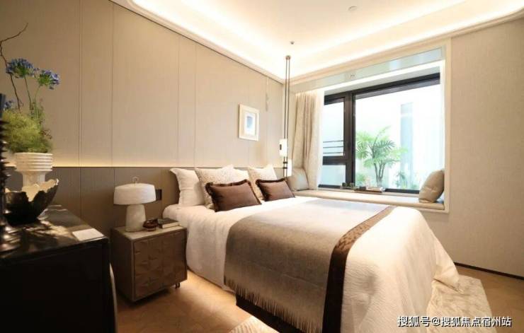 再来看看134㎡3室2厅2卫样板房。比起112㎡户型,这个客厅要宽敞很多,岛台也可以做成独立样式,摆放6人长桌也绰绰有余。主卧采用270度拐角飘窗设计,采光面拉满。