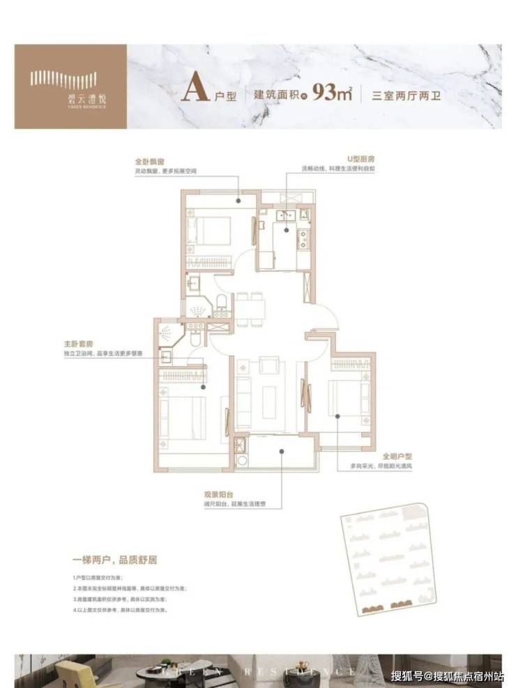 约93㎡户型做了两卫,套房主卧,居住空间相当舒适了。
