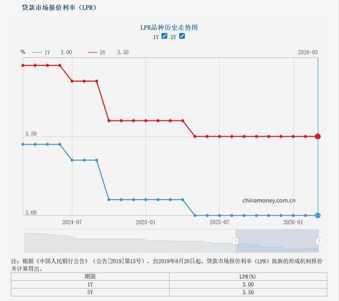 3月20日,中国人民银行授权全国银行间同业拆借中心公布,2026年3月20日贷款市场报价利率(LPR)为:1年期LPR为3.0%,5年期以上LPR为3.5%。以上LPR在下一次发布LPR之前有效。