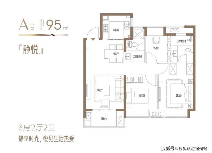 『静悦』约95㎡3房2厅2卫:三开间向阳户型,面朝风景,沐浴阳光;全明通透,让阳光照进每一寸惬意生活;户户飘窗,逐光而居,延伸空间尺度;全明卫设计,赋予私密空间明亮与清新;。方正有序的空间艺术,舒适实用,张弛有度