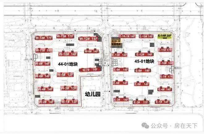 根据设计方案显示,44-01地块拟建14栋12-17层的高层;45-01地块拟建16栋11-17层高层住宅,其中E-14#为保障房。