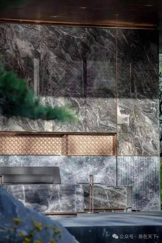 位于社区中央的第二景观会客厅聆星客厅,立面装饰有极具典藏价值的威尼斯棕奢石、吊顶采用铝板切割镶嵌、地面采用阿尔卑斯灰和福鼎黑拼花铺装。