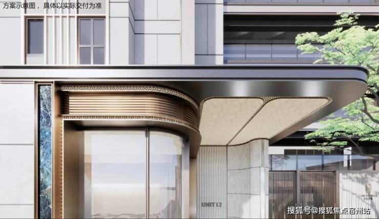 在楼栋主入口同样运用 石材+弧形铝板 等元素,同时还有格栅装饰,质感提升明显: