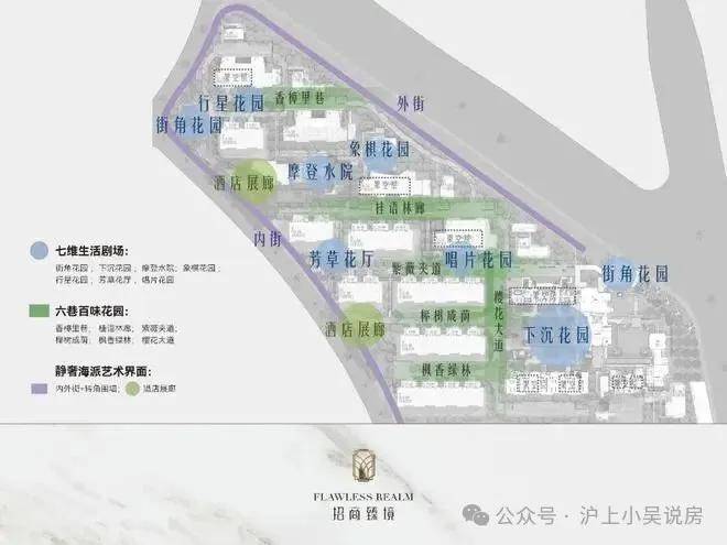 #招商臻境精心规划了七维生活剧场,包括: 街角花园、摩登水院、下沉花园等七重生活场景,营造四季分明、美景如画的精致水岸归家之路。