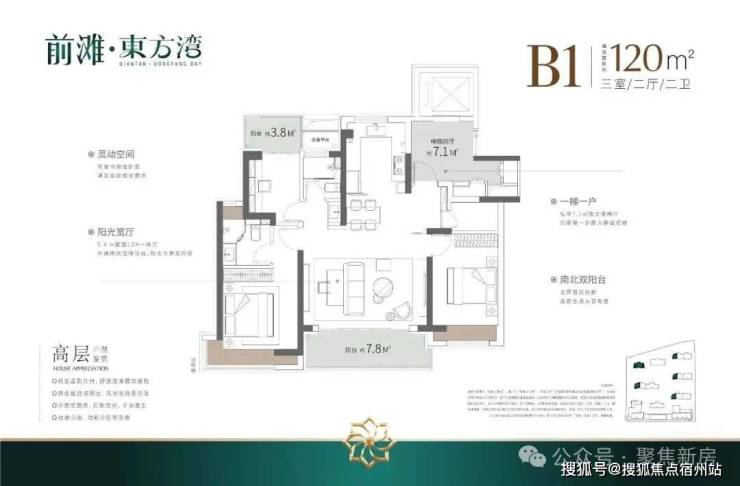 建面约120㎡3房2厅2卫,做到了3开间朝南+双阳台+主卧套房设计+270°转角飘窗,居住体验、舒适度、尺度感倍增。