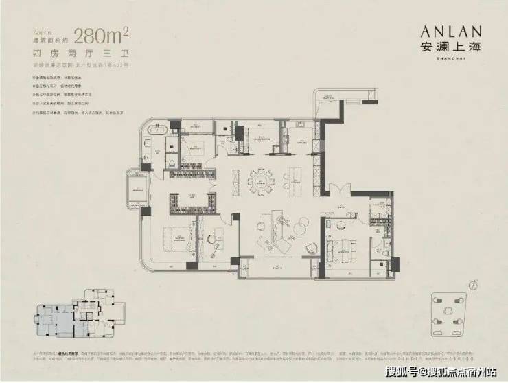 建面约280㎡4+1 房户型,以约72㎡LDKB一体化厅,家庭互动核心;环幕总面宽约51米,南向面宽达22米; 主卧配套齐全:衣帽间+空中花园;灵动空间可改造,适应多元需求。、