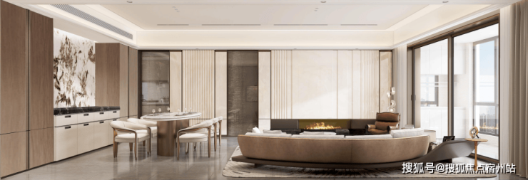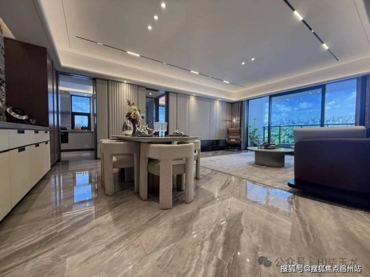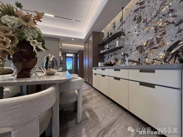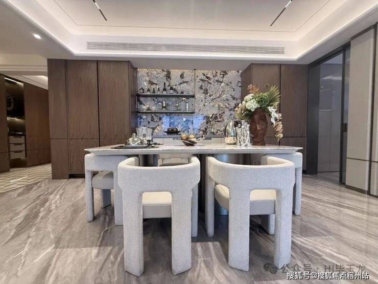 玄关间空非常宽敞,配置有定玄制关柜,出更入具仪式感。客厅餐区域,餐厅、电视背墙景面都是材石的,地面是瓷砖铺就,配置有定制餐边柜、弗兰卡水的槽和头龙等。