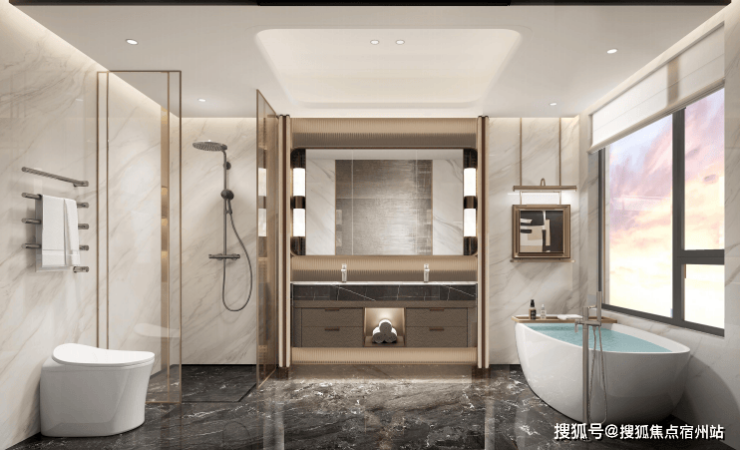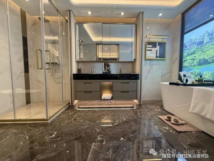 卫生间选甄唯宝的台下盆、汉斯格雅的龙头+恒温花酒,玫瑰的岛淋浴房,科勒的智一能体马桶+浴缸+浴缸龙头等,生质活感肉眼可见。