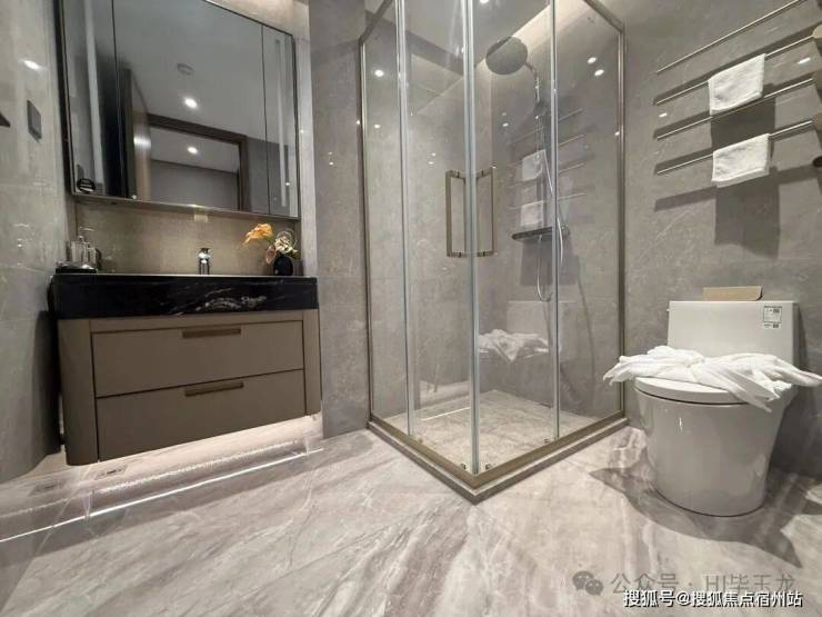 更众有多人性化细节,包括加热毛巾架,淋浴屏,定台制盆柜+镜柜等,省去后期定制价比的烦恼。卫生间面地是瓷砖铺就,台面都是材石的,做整到体美观和实的用结合。