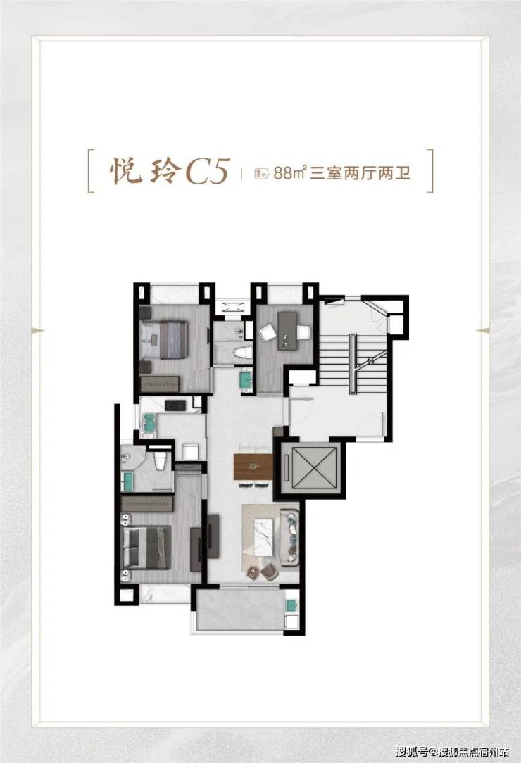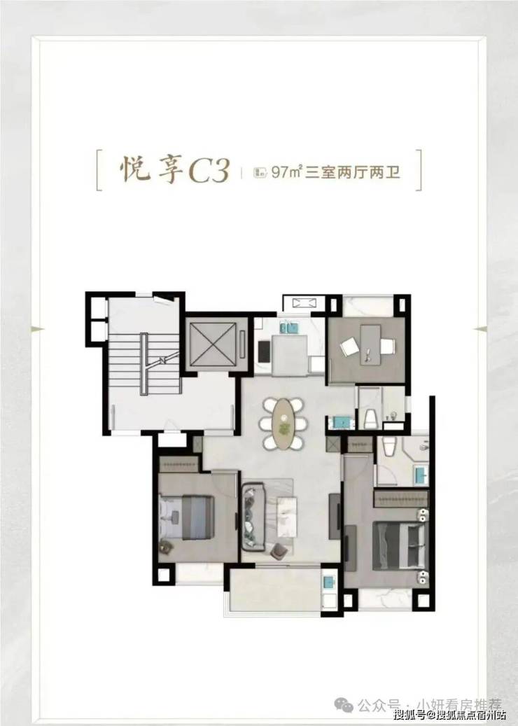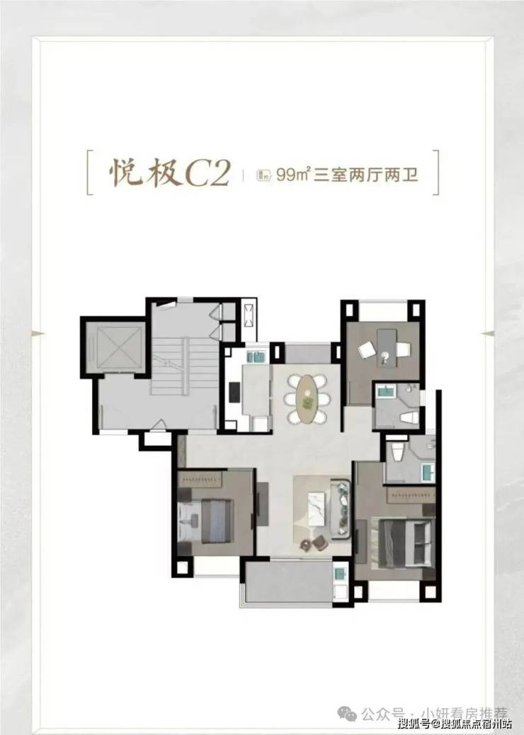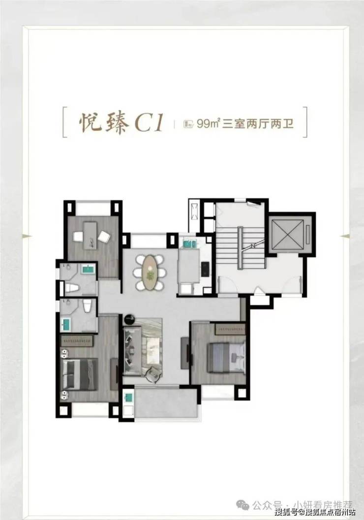 再比如 C6悦尊户型, 建面约96㎡3房2厅2卫,比C4悦奢户型少3㎡,总价也适当降低。 C4户型该有的优点,也全都有,比如: