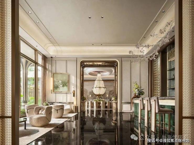 比如入户门选用了定制化的仿铜铸铝门,嵌入普拉达绿奢石中古铜色门牌号,高级酒店般的质感营造的非常细腻。