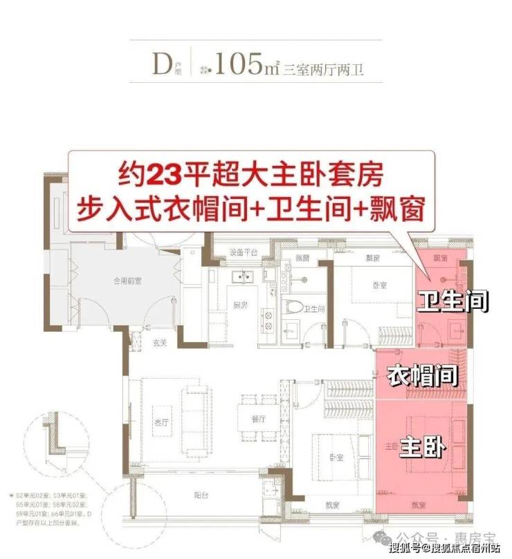 整体约10㎡附赠面积,综合得房率约85%。另外,项目还有建面约105㎡3房2卫明星户型,设计更为亮眼。