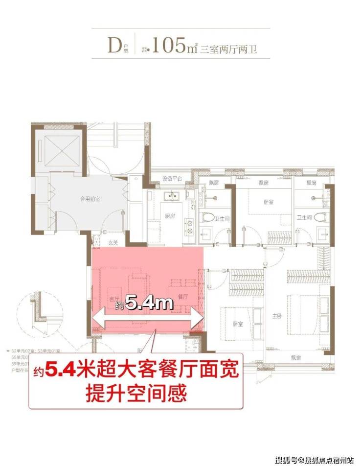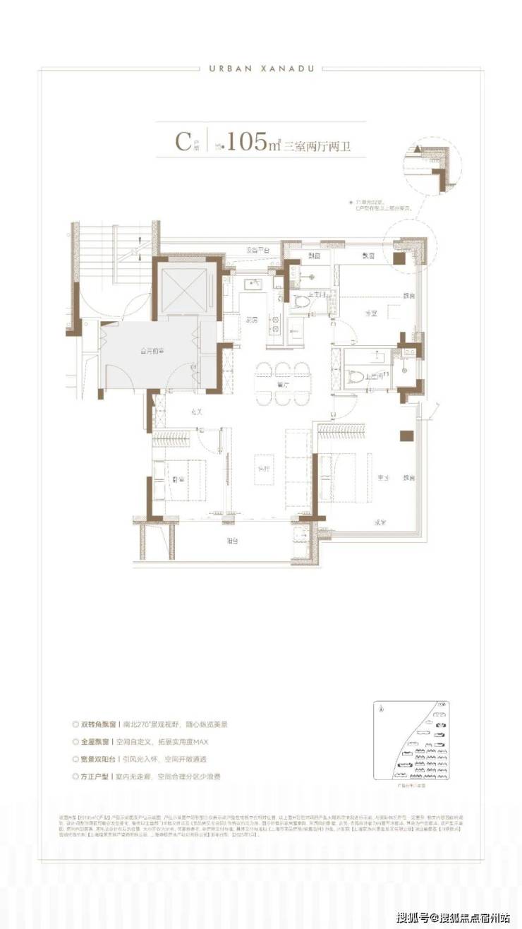 9#南向有中轴景观和别墅区,向西与6#略错开,也有不错的瞰景视野,主力建面约105㎡户型,总价相对较低,性价比更高!我们重点来看主力的建面约105㎡3房2卫户型: