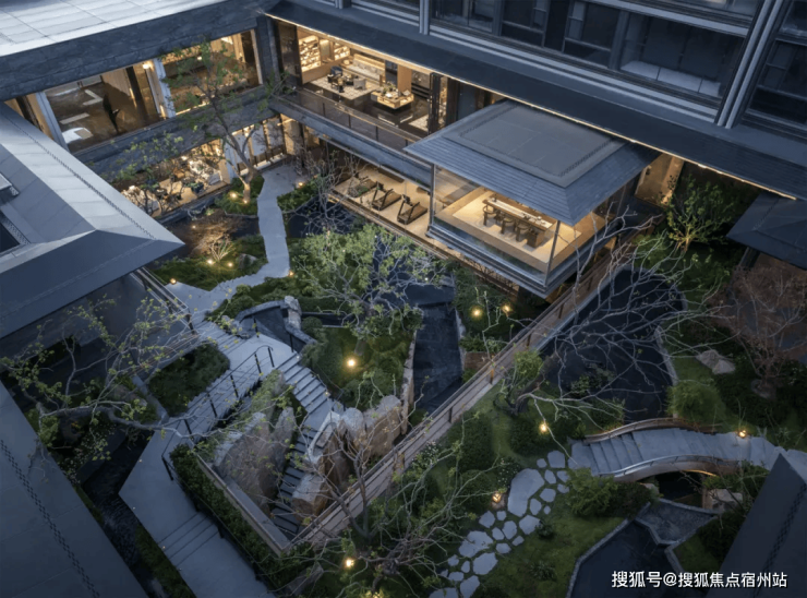 下沉式庭院 :打造落差 6 米的下沉式立体景观,搭配叠水、小桥、连廊、绿植,形成 “庭院深深深几许” 的东方意境,同时衔接社区会所,实现景观与功能的完美融合。