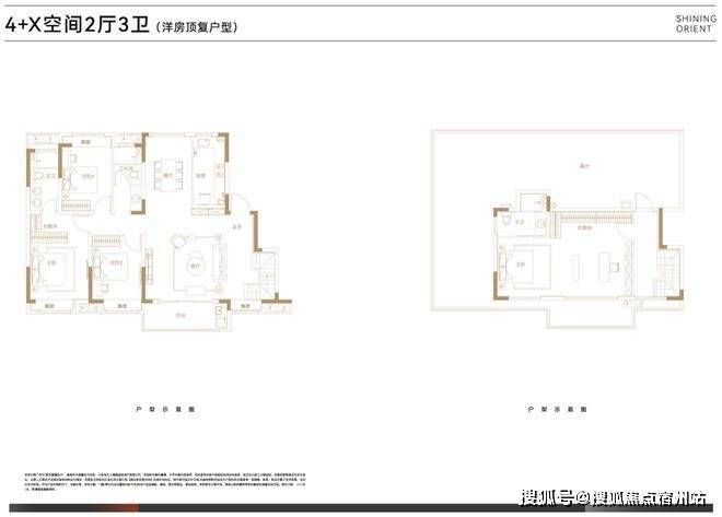 叠墅总高四层,设计了邻里空间,单元门设计也是非常的大气。上叠125㎡三房两厅三卫,顶楼闷顶层等可以拓展空间;下叠140㎡四房两厅三卫,另有超宽裕的赠送面积。