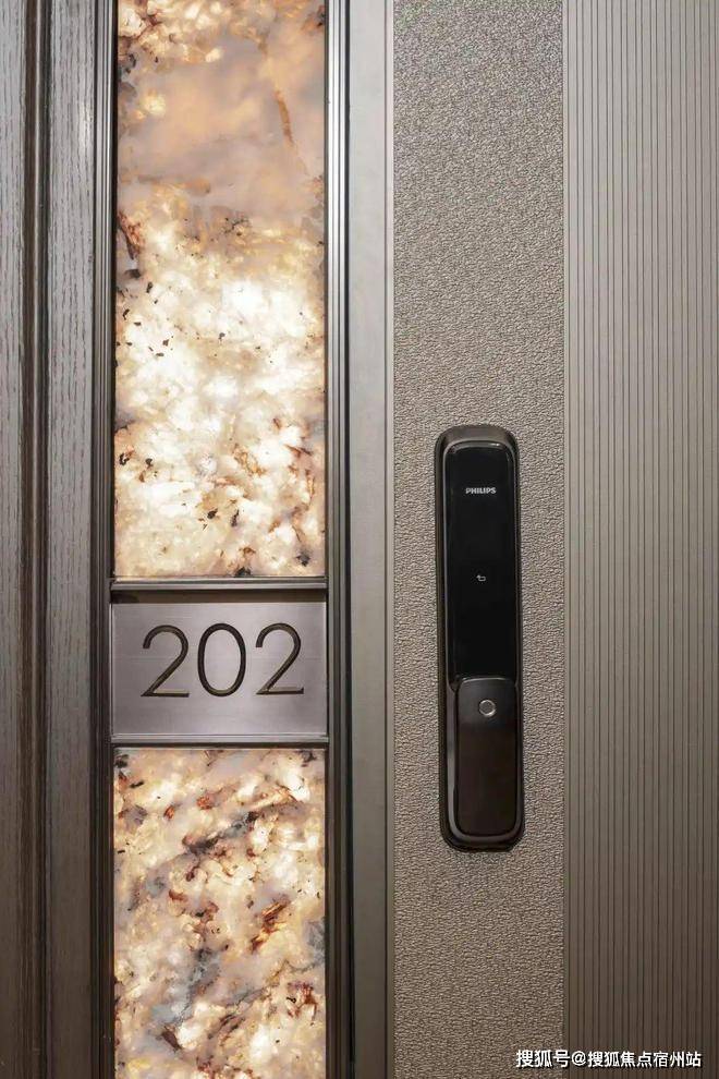 入户门一侧以奢石背景板,内嵌灯带,后期门牌号也会内置灯带,✅✅越秀杨浦天玥售楼处电话:400 - 882 - 4258✅✅让入户门前更加明亮美观,增强归家的幸福感。