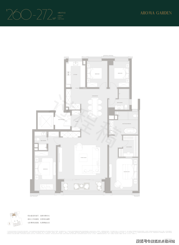 建面约260/272㎡,南向双套房,尤其主卧是豪华套房,带独立衣帽间,卫浴间含双台盆+淋浴+浴缸+马桶四件套。
