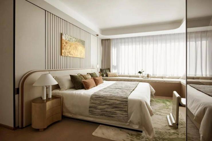 主卧套房设计,尺度惊人,贯穿南北,预留步入式衣帽间的空间, 配备270°转角飘窗,实现无界视野和优异采光,大宅气度油然而生!