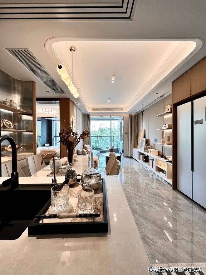 而蓝金沙岩板,金色脉络与深蓝色基调交相辉映,平添了一份奢华与神秘的美感,带来一种遨游宇宙的感觉,大面积的镜湖春晓奶茶色岩板,亦以其淡雅内敛的光泽,带来非同一般的尊贵感。