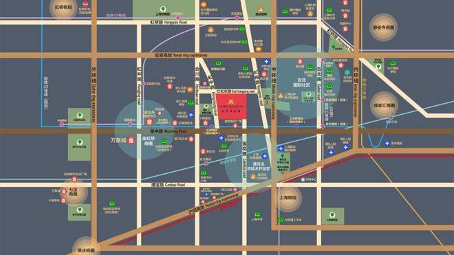 项目地处长宁、徐汇、闵行三区交汇的金虹桥板块的核心区位,拥有多维立体的交通,延安高架、中环线、外环线环伺。