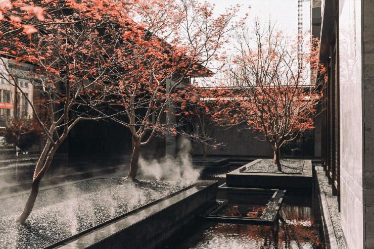 从空中俯瞰,跌水水景、亲水平台、色叶树阵等多重景观交融,展开一幅无与伦比的山水画卷。