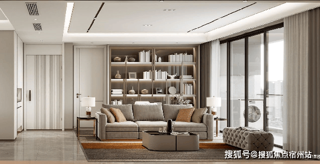 客厅和主卧都标配悬浮吊顶、无主灯设计,背景墙采用皮革和铝合金拼接,也都是实体交付的。
