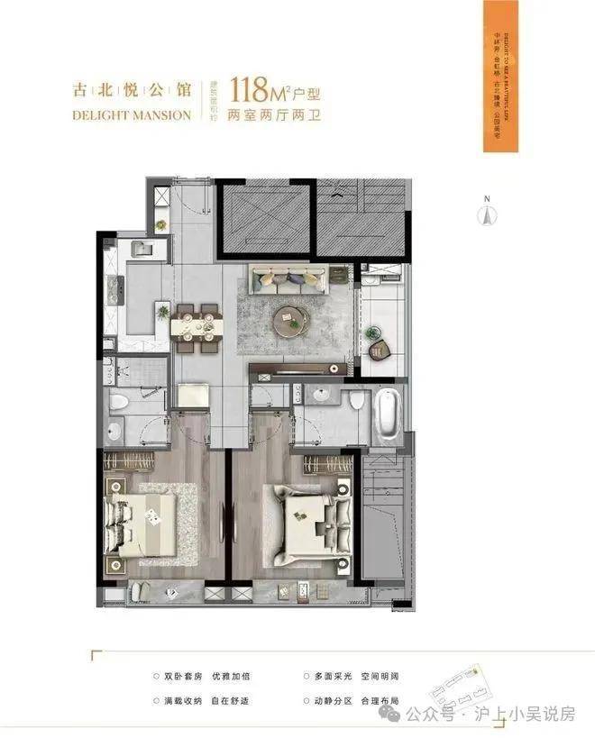 古北悦公馆项目匠心打造建面约51-70㎡的一室户型(总价非常友好)及约118㎡的两室户型,恰逢其时地响应了新上海人首次置业更优区位的愿望,同时也可以满足了改善型购房的生活需求。