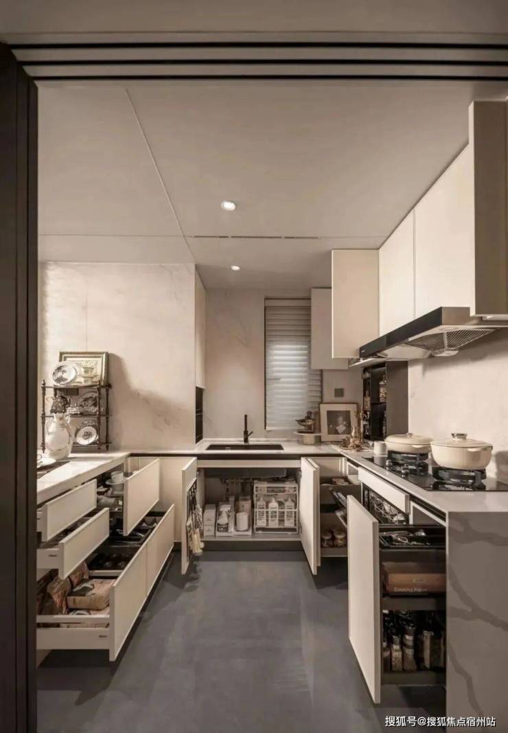 厨房更是收纳主场,设置了多功能调味拉篮、定制谷物抽屉,让瓶罐各归其位,烹饪时少了琐碎,多了诗意。