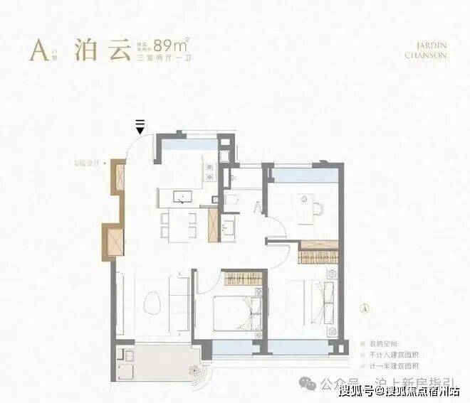建面约89㎡3房户型,利用科学的收纳和S墙设计保障了室内空间的井井有条,又通过大量飘窗和阳台等提升尺度感,厨房也附带飘窗。