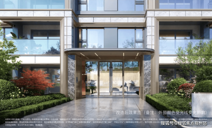 入户大厅的外墙上也采用香槟金铝型材与灰色石材,门头雨棚采用香槟金色弧形铝板装饰,搭配大玻璃面,尊崇感呼之欲出。