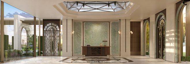 社区主入口复刻华尔道夫酒店仪式,严谨的柱廊序列在米色石材上投下充满韵律的光影,穹顶与拱券,瞬间将归家情绪升华至艺术层面。