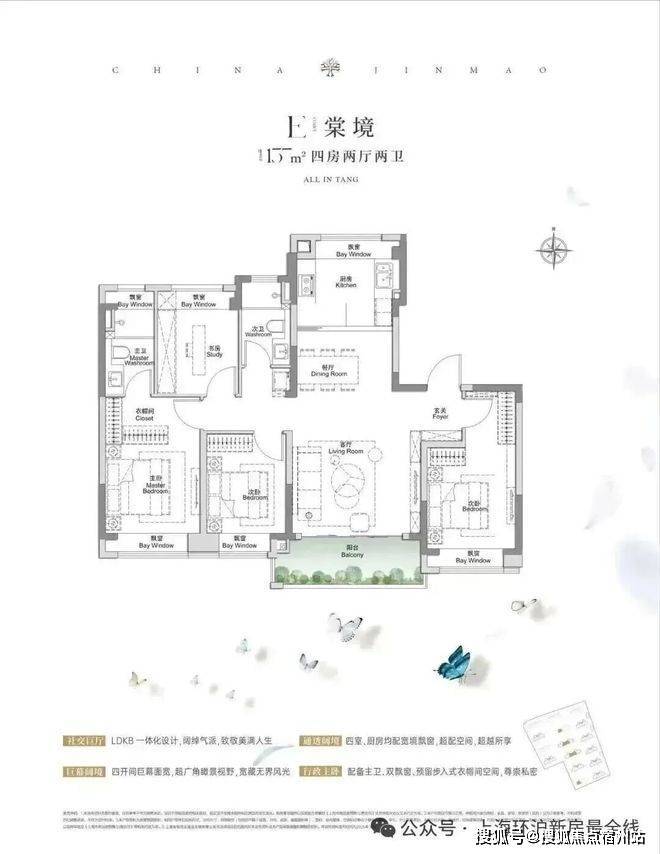 建面约117㎡3房2厅2卫,做到了3+1开间朝南+5个飘窗+主卧套房设计+270°转角飘窗,所有的尺度都有进一步提升。