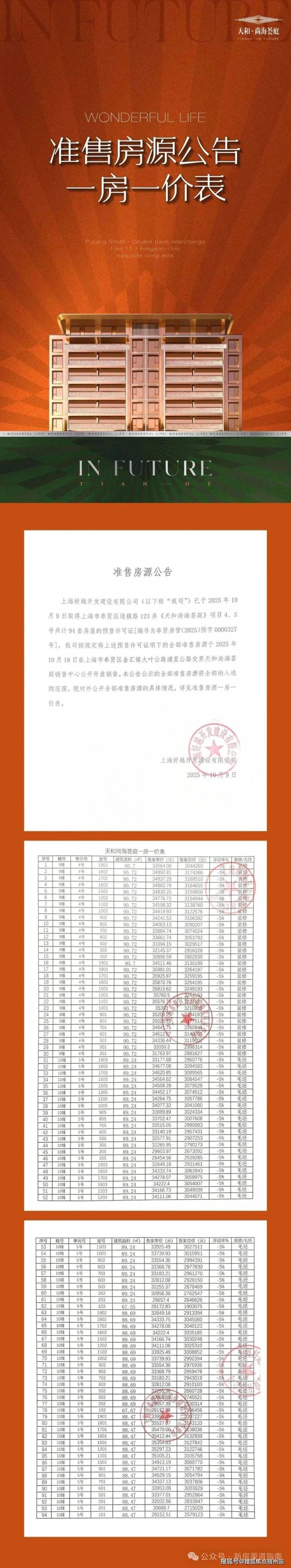 最新消息:一房一价表发布!奉贤金汇「天和尚海荟庭」推出建面约49-91㎡高层,共计350套,过会均价35888元/㎡!