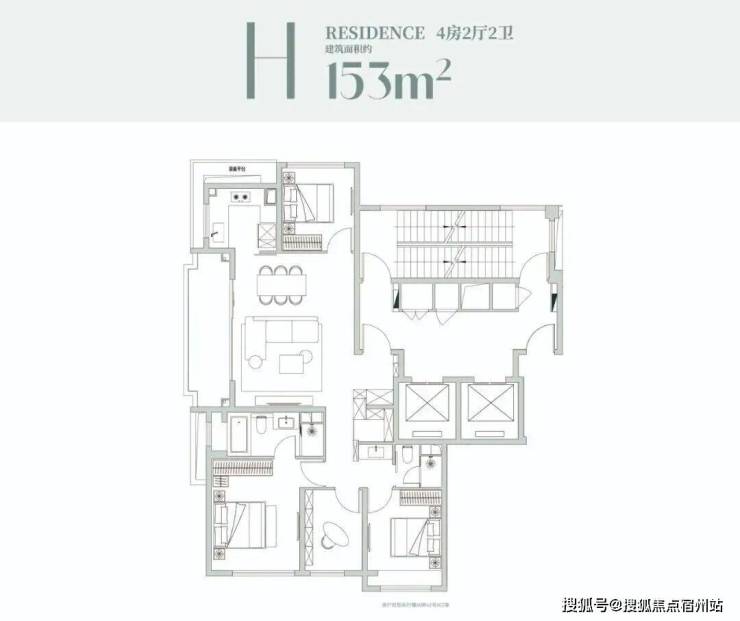 该户型是经典的四叶草布局,四开间分布在四角,兼顾私密与互动,是二胎家庭的优选;