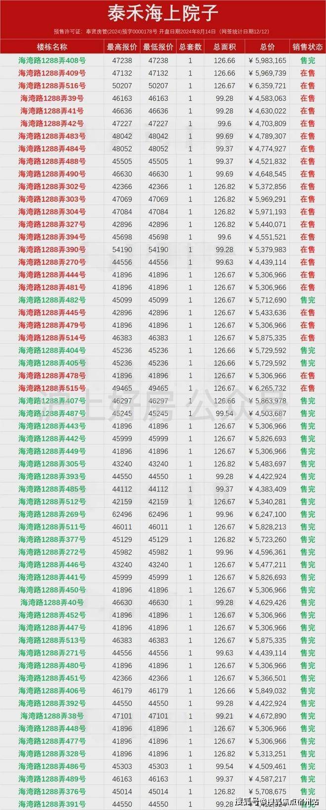 根据公示,泰禾海上院子已经于2024年7月4日取得预售许可证至今分三次开盘销售,总套数591套,已售315套。泰禾海上院子售楼处电话☎:400-8266-670✅✅剩余276套在售(信息来源上海房地产信息网)三批次6月27号取证,目前可以直接认购。泰禾海上院子售楼处电话☎:400-8266-670✅✅