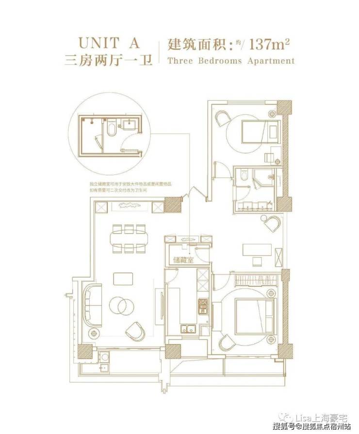 独立储藏室可用于安放大件物品或是闲置物品,如有需要可二次交付改为卫生间。