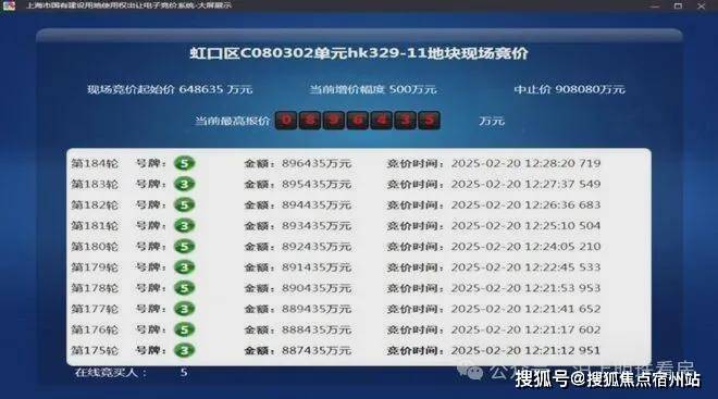 2025年2月,今年第一批次土拍中,经过184轮竞价,金茂&庆隆联合体以总价896435万元竞得虹口C080302单元hk329-11地块,溢价率38.2%,折合楼板价117474元/㎡,装修标准不小于4000元/㎡。