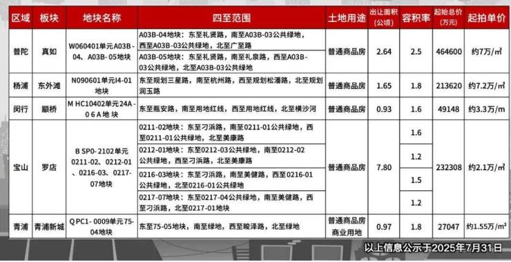 9月4日,上海2025年土拍市场将迎来 第七批次竞拍!此次出让的五宗地块,总起始价约 98.67亿元,分别分布在杨浦、普陀、闵行、宝山与青浦,涵盖核心城区与外环新城的不同板块。