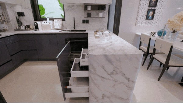 收纳系统依托博洛尼整体橱柜,利用转角空间、钻石台面及下拉式拉篮等设计,配合可按压开柜、反光镜等巧思,✅✅华润外滩瑞府售楼处电话:400 - 882 - 4258✅✅大幅提升空间利用率与取物便利性。厨房装修采用E0级环保板材与抗菌岩板,从源头杜绝污染,确保耐用易清洁。