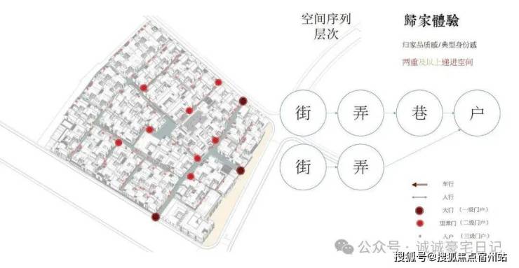 士林润园社区规划可分为蓬莱路城市公共景观以及社区内部景观两个部分,其中市政绿地衔接于上海2035城市总体规划中“蓝绿丝带”的上位条件要求,社区内部街巷空间形成空间序列形成递进的层次,将归家体验的序列依次展开,形成城市街道→入口(一级门户)→街巷→节点空间→里弄门(二级门户)→合院入户(三级门户)的方式,基本可保证大多数住户可体验到两重以上的空间递进。