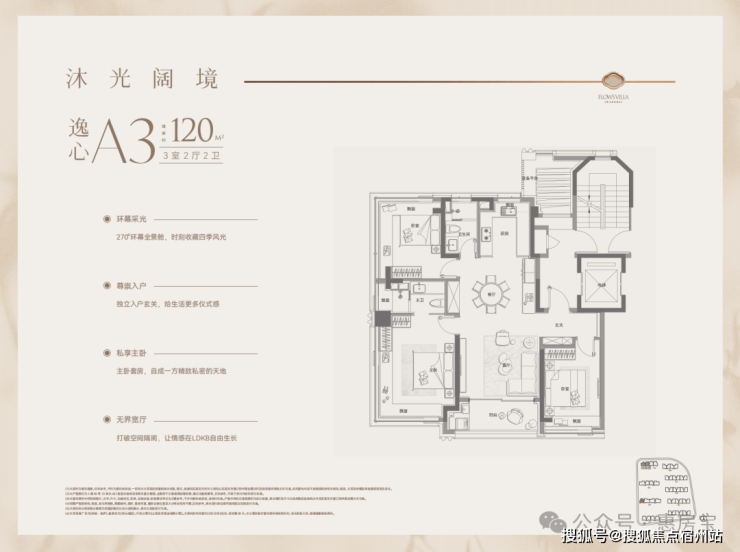 270°转角全景客厅 ,专属于待客与家庭欢聚;楼下为静谧休息区,确保家人生活互不干扰,呵护隐私。 三间卧室均配备独立卫生间,全套房设计充分尊重每一位家庭成员的私密与舒适,彰显人文关怀。