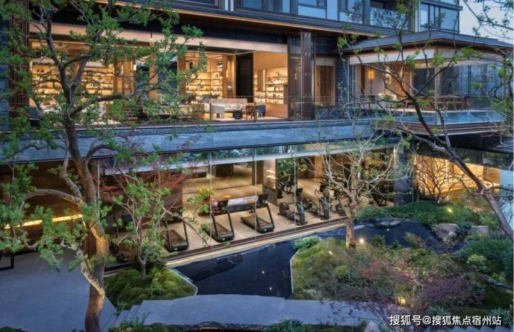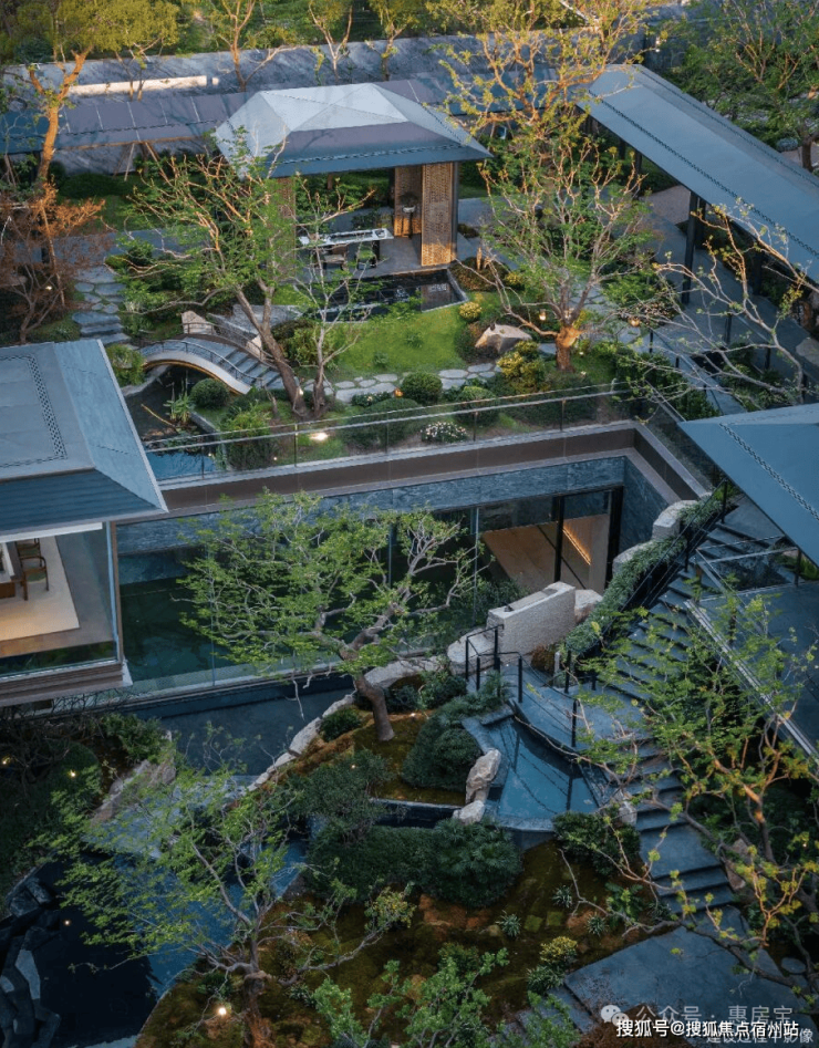 而最令人惊艳的,当属 约6米地势差打造的下沉式山水庭院,山、石、水、林有序交织,犹如一幅“豁然开朗山水轴卷,每一步皆是景致,每一处皆有不同。