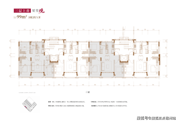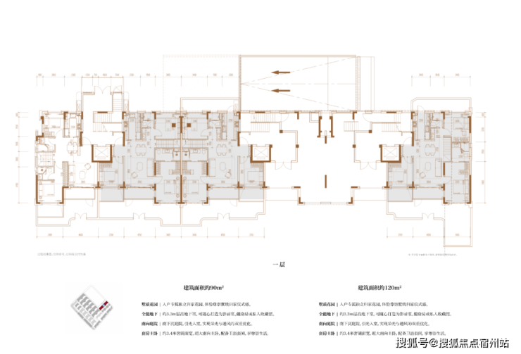 2、从内部空间体系来看,地上三层,层高分别是3.6米、3.3米和3.3米;每个单元一梯两户,每户均拥有类独立电梯厅;一楼带地下室及庭院,并通过创新退台式设计为二楼和三楼打造私家空中花园,形成户户有花园的墅居生活方式。
