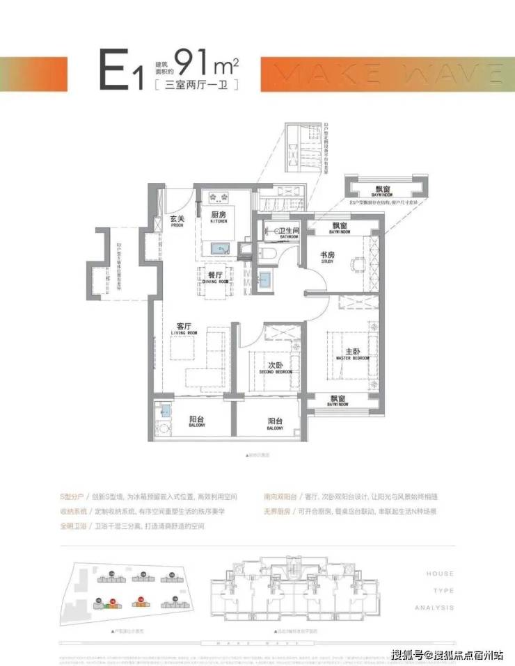 而招商·时代潮派|东屿此次建面约91㎡户型,就做出来了比市面百平户型更好的的“ 南向双阳台+南北双飘窗”设计。