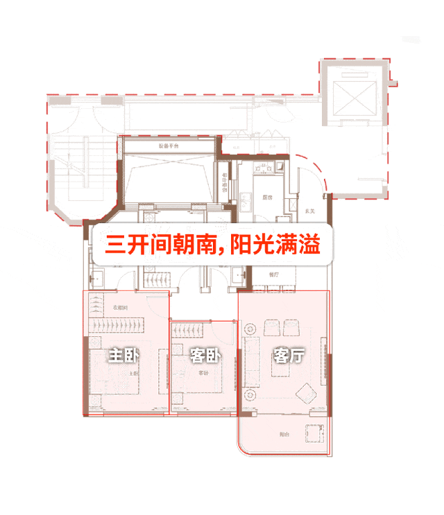 三开间朝南,南向面宽达 约10米 ,阳光充足;餐客厅与阳台形成 流畅动线 ,社交空间舒适开阔; 弧形阳台 放大景观视野;主卧 预留独立衣柜空间 ,卫生间罕见 南向采光 ,舒适度拉满。