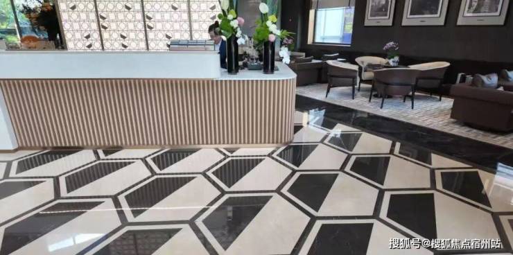 酒店式落客门庭很有气势,采用定制化拼花铺装,同时在两侧打造了静谧的水景,与对面的桃浦中央绿地相呼应。